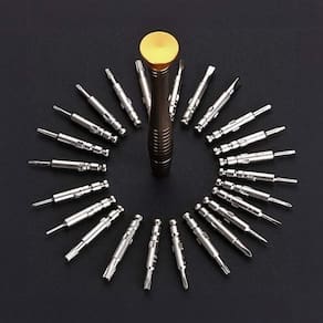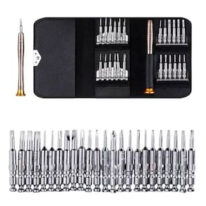 25 pontas de precisão para parafusos de diversos tipos e tamanhos, incluindo fenda, Phillips, Torx, estrela, triângulo e agulha.