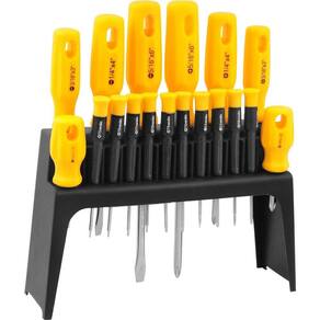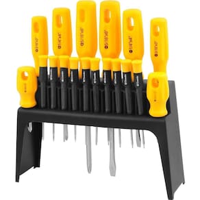 1 Jogo de chaves de fenda/phillips/hexalobular composto por com 18 peças, sendo: 1 chave hexalobular de precisão T5 x 50,0 mm, 1 chave hexalobular de precisão T6 x 50,0 mm, 1 chave hexalobular de precisão T7 x 50,0 mm, 1 chave hexalobular de precisão T8 x 50,0 mm, 1 chave hexalobular de precisão T9 x 50,0 mm, 1 chave hexalobular de precisão T10 x 50,0 mm, 1 chave de fenda de precisão 2,5 mm x 50,0 mm, 1 chave de fenda de precisão 3,0 mm x 50,0 mm, 1 chave phillips de precisão PH00 x 50,0 mm, 1 chave phillips de precisão PH0 x 50,0 mm, 1 chave de fenda 6,0 mm x 38,0 mm (1/4" x 1.1/2"), 1 chave de fenda 5,0 mm x 75,0 mm (3/16" x 3"), 6,0 mm x 100,0 mm (1/4" x 4"), 8,0 mm x 150,0 mm (5/16" x 6"), 1 chave phillips PH2 x 38,0 mm (1/4" x 1/1/2"), 1 chave phillips PH1 x 75,0 mm (3/16" x 3"), 1 chave phillips PH2 x 100,0 mm (1/4" x 4"), e 1 chave phillips PH3 x 150,0 mm (5/16" x 6"). Acompanha suporte plástico.
