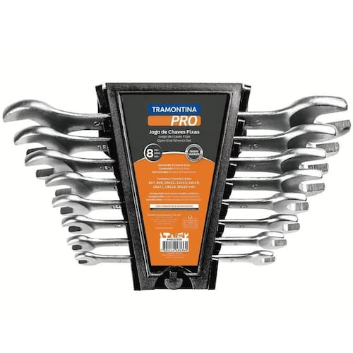 Jogo De Chaves Fixa 6A22Mm Com 8 Peça 44610/308 Tramontinapro Produto: Jogo de chaves fixas 6 a 22 mm com 8 peças em aço cromo vanádio - 44610/308 Marca: Tramontina PRO Descrição: O Jogo de chaves fixas 6 a 22 mm com 8 peças em aço cromo vanádio 44610/308 Tramontina PRO, é feitos em aço cromo vanádio forjado e temperado, não apenas oferecem uma resistência superior, mas também possuem uma camada de acabamento cromado que as protege contra a corrosão. Além disso, o cuidadoso processo de usinagem das cabeças e a calibragem precisa da abertura das bocas asseguram encaixes perfeitos, aumentando a eficiência e seguro manuseio. Para garantir que esteja sempre preparado, o jogo inclui um suporte plástico resistente, ideal para organizar e transportar suas ferramentas com facilidade. Vejamos em detalhe o que o conjunto oferece: Características: • Construção Robusta: Aço cromo vanádio forjado e temperado. • Acabamento: Cromado para maior resistência à corrosão. • Suporte: Plástico resistente para armazenamento prático. • Tamanhos Inclusos: 6x7, 8x9, 10x11, 12x13, 14x15, 16x17, 18x19, 20x22 mm.Especificações: Material: Aço cromo vanádio. itens Inclusos: O jogo contém 8 Chaves fixas dos seguintes tamanhos: 6x7; 8x9; 10x11; 12x13; 14x15; 16x17; 18x19; 20x22; 21x23; 24x26; 25x28; 27x32 mm .