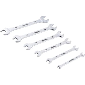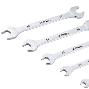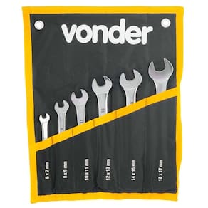 1 Jogo de chaves fixas composto por estojo em lona com 6 chaves, sendo: 6 mm x 7 mm, 8 mm x 9 mm, 10 mm x 11 mm, 12 mm x 13 mm, 14 mm x 15 mm e 16 mm x 17 mm. Produzido em aço cromo vanádio, proporcionando melhor qualidade e durabilidade. Possui acabamento cromado, que oferece maior proteção contra oxidação/corrosão. Possui ainda pontas estreitas que possibilitam o uso em locais de difícil acesso. Indicado para apertar e soltar porcas e parafusos sextavados. Nunca utilizar prolongadores sobre as chaves, pois essa ação aumenta o torque e diminuirá a vida útil.