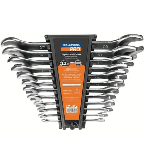 Produto: Jogo de chaves fixas 6 a 32 mm com 12 peças em aço cromo vanádio - 44610/312 Marca: Tramontina PRO Descrição: O Jogo de Chaves Fixas 6 a 32 mm com 12 peças em aço cromo vanádio 44610/312 da Tramontina PRO, é uma solução completa e de alta qualidade para profissionais exigentes e amadores habilidosos. Cada chave neste jogo é meticulosamente forjada em aço cromo vanádio e submetida a um rigoroso processo de têmpera, assegurando durabilidade superior e resistência contra desgastes. Além disso, o acabamento cromado não só adiciona um visual elegante, mas também fornece uma proteção extra contra a corrosão. Facilmente organizadas em um suporte plástico resistente, estas ferramentas estão sempre prontas e acessíveis para qualquer desafio que possa surgir em seu ambiente de trabalho. Características: • Abertura da boca calibrada: O ajuste perfeito minimiza o risco de danificar as cabeças de parafusos e porcas. • Cabeça usinada: Precisão garantida para os ajustes mais refinados. • Facilidade de armazenamento: Com um prático suporte plástico, localizar a chave adequada torna-se rápido e eficaz.Especificações: Material: Aço cromo vanádio.