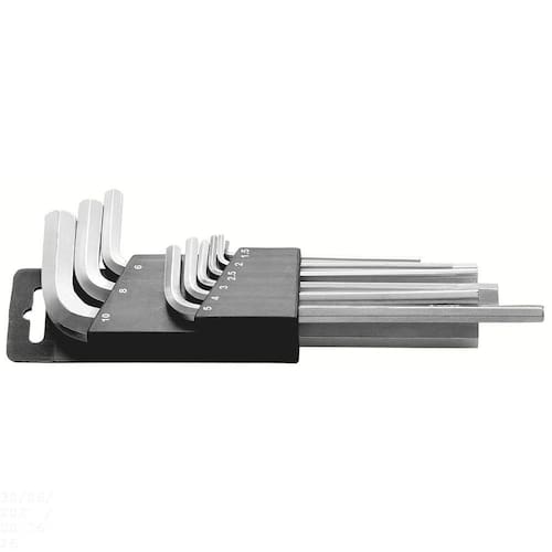 O Jogo de Chaves Hexagonais Longas Tramontina em Aço Especial 9 Peças é a escolha ideal para auxiliar você em diferentes tarefas. Projetado para apertar e afrouxar parafusos com perfil sextavado interno, possui 9 chaves hexagonais longas com haste em aço especial. Além disso, possuem acabamento cromado. Apresentam os tamanhos de 1.5 mm a 10 mm. São produtos que não podem faltar na sua caixa de ferramentas! Orientações Haste em aço especial.Acabamento cromado.As chaves tipo L são submetidas a ensaios de torque e de dureza para analisar a resistência mecânica e atender aos valores da norma específica. As chaves tipo L possuem dois braços de comprimentos diferentes, e ambas extremidades podem ser utilizadas dependendo do local onde será realizado o trabalho. Ao utilizar o braço mais longo tem-se mais torque, enquanto o braço mais curto promove uma operação mais rápida. Apertar ou afrouxar parafusos com sextavado interno. As ferramentas são produzidas e testadas conforme normas específicas. Características Gerais EAN13 7891114118520 DUN14 17891114118527 NCM 8205.40.00 Peso Líquido 0,3700 kg. Peso Bruto 0,3700 kg. Metragem 0,000840 m³. Dimensões Embalagem (Compr. X Larg. X Alt.) 280x 100x 30 mm. Dimensões Produto (Compr. X Larg. X Alt.) 280x 100x 30 mm. Observações Use óculos, luvas e outros equipamentos de proteção de acordo com a tarefa a ser executada. Utilize o tamanho certo da chave para cada bitola de parafuso. Não faça aproximações de dimensionais, polegadas para milímetros, por exemplo. Não use tubos ou extensões para obter mais torque. Não golpeie as chaves. - Armazene em local limpo e seco.