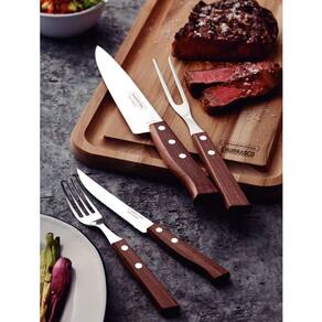 Características: - Lâminas de aço inox. - As lâminas das facas têm maior durabilidade do fio devido ao tratamento térmico. - As lâminas dos garfos contam com maior espessura e uma estampagem do aço que garante maior resistência, evitando deformações. - Os cabos são de madeira natural. - Rebites de alumínio.
