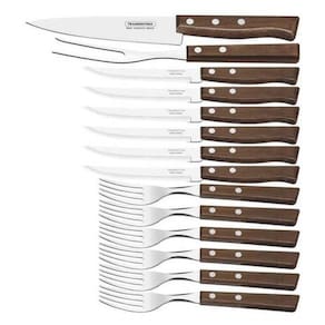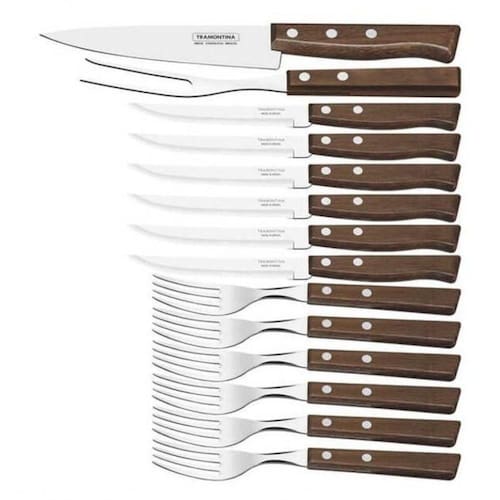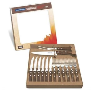 Jogo De Churrasco Tramontina Cabo De Madeira Natural 14 Peças Rústica e natural a linha Tradicional combina com um bom churrasco. As lâminas de aço inox permitem um corte fácil e . O cabo em madeira natural dá um charme todo especial à sua mesa. Com Tramontina, servir bem já virou tradição.- Linha TRADICIONAL. Recomendações de Uso: Antes do uso: Antes de utilizar o , remova as eventuais etiquetas e lave-o com água e de uso: Durante a lavagem use somente esponja macia, outros tipos de produtos, como palha de aço, poderão riscar ou prejudicar o brilho do aço inox. Enxágue bem a peça a fim de remover totalmente os resíduos dos produtos de limpeza, que por serem abrasivos, podem danificar o inox. Após a lavagem enxugue a peça, pois as substâncias químicas contidas na água poderão causar manchas. Sempre que possível use água quente, pois renova o brilho do talher. Evite o das peças com superfícies quentes, pois podem provocar a descoloração do produto.- Foto meramente ilustrativa.- Embalagem litografada. Informações Adicionais: