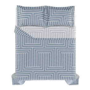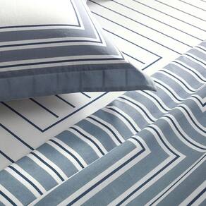 A colcha possui cantos quadrados e dupla face e o porta travesseiros tem 3 abas de 5cm enriquecendo ainda mais a cama. Sua estampa rotativa, tem o fundo azul e linhas pretas com contornos brancos formando traços por toda sua extensão. E o verso, é com fundo branco e linhas pretas. O jogo de colcha possui um matelassado tradicional e seu enchimento recebem o tratamento thermobond que faz com que a espuma fique uniforme por muito mais tempo aumentando sua vida útil.