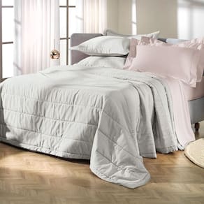 Produzido em Cetim 300 fios 100% algodão, o Jogo de Colcha possui toque extremamente macio, proporcionando o máximo de qualidade, conforto e leveza para a hora de dormir.
