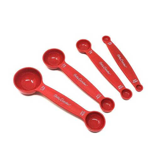 Jogo de colheres medidoras plástico Cor: vermelho Os medidores se encaixam um no outro facilitando o seu armazenamento. Feito de plástico durável, livre de bpa, cada colher possui dois medidores diferentes em cada extremidade com tamanho das letras fáceis de ler, em unidades métricas e imperiais.