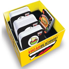 - Inclui mais de 200 cartas de vocabulário para diferentes níveis de habilidade: cartas de aperitivo (mais fáceis), cartas de palavras principais (dificuldade média) e cartas de sobremesa (mais desafiadores), bem como 12 cartas de menu de restaurante que incluem 48 opções de tópicos de conversa para jogadores.