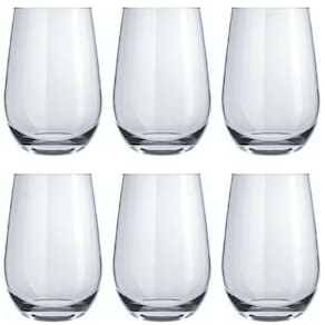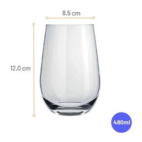Garantia: 90 dias / Peso: 960g / Cor predominante: transparente / Referência: 7891155039990 Dimensões: 8,5cm (D) x 12cm (A); Capacidade: 480ml; Quantidade de peças: 06; Indicado para: água, sucos, refrigerantes ou vinhos; Material: vidro cristalino.