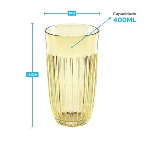 - Dimensões 8 x 14,5cm diâmetro x altura . - Capacidade de 400ml, perfeitos para diversas bebidas. - Relevo externo canelado. - Copos de vidro de alta qualidade. - Design elegante e moderno. - Conjunto com 6 unidades.