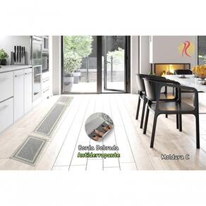 Acabamento com overloque e barra dobrada nas pontas garante durabilidade e fixação, enquanto a base antiderrapante aumenta a segurança em áreas de circulação.