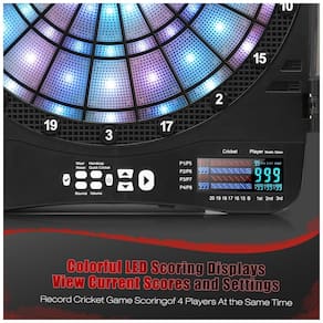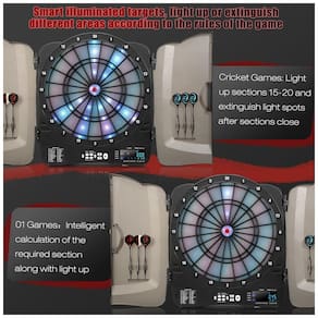 Display de Pontuação em LED: Com uma área-alvo de 34,3 cm e um display colorido, as pontuações podem ser visualizadas com clareza mesmo a uma distância de até 3 metros, mesmo em ambientes escuros. É possível acompanhar as pontuações de até 4 jogadores simultaneamente no estilo XO, com segmentos iluminados, pontuação automática e comandos de voz para uma experiência ainda mais emocionante.