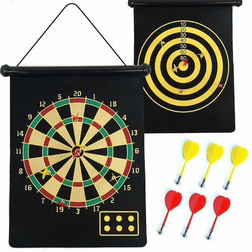 Mais seguro por não utilizar agulhas, este jogo utiliza setas com fortes imãs, que além de dar mais segurança para os jogadores, não danifica o alvo. Ideal para qualquer ambiente, inclusive para crianças, pois não tem perigo de se machucar com o dardo e também não fura a parede ou chão quando erra o alvo. Com tecido flexível e magnético, é muito resistente. Sinônimo de qualidade e elegância, desenvolvido para todos os jogadores. Fácil de pendurar e jogar. Características: Fabricante: Sanxia Comercial Ltda. País de Origem: China Assunto: Brinquedo Infantil Código de Barras: 6926939780452 Idade mínima: Indicado a partir de 5 anos. Dimensões aproximadas da embalagem: 43 x 10 x 10 cm. Dimensões aproximadas do produto: 48 x 37 x 2 cm. Peso: 0,725 kg. Composição/ Material: Plástico Itens Inclusos: 1 Placa de Dardo e 6 Dardos Magneticos.