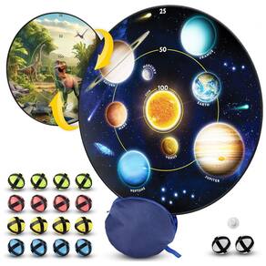 Componentes Inclusos: Alvo reversível de 71cm que brilha no escuro com temas de dinossauros e sistema solar, 2 bolas espaçadoras, Suporte de ventosa, Bolsa de armazenamento, 16 bolas de dardo que brilham no escuro,