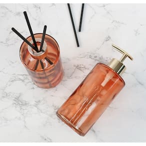 O Kit Frasco Difusor com Porta Sabonete Líquido é a combinação perfeita de estilo e funcionalidade. Composto por um frasco difusor com 5 varetas e um porta sabonete líquido, ambos com design em vidro e detalhes elegantes. O pump dourado do porta sabonete líquido e a tampa do difusor em gold rose acrescentam sofisticação ao ambiente, tornando o kit ideal para decorar banheiros ou lavabos.