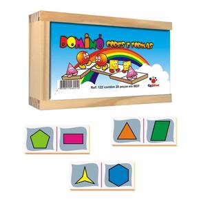 Contém 28 peças de 7 x 3cm, com imagens de formas geométricas em diferentes cores.
