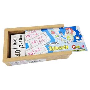 O Jogo de Dominó de Tabuada modelo 1227 da Carlu, acompanha 28 peças serigrafadas com tinta atóxica medindo aproximadamente 7cm x 3,5cm, todas acondicionadas em uma caixinha de madeira tipo estojo.