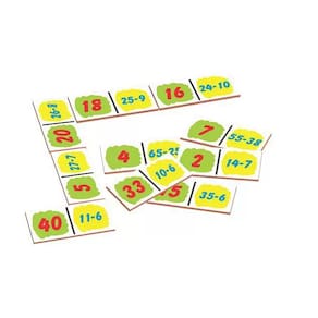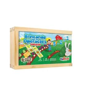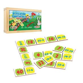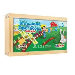 Contém 28 peças de 7 x 3cm, com imagens de operações matemáticas e seus resultados.