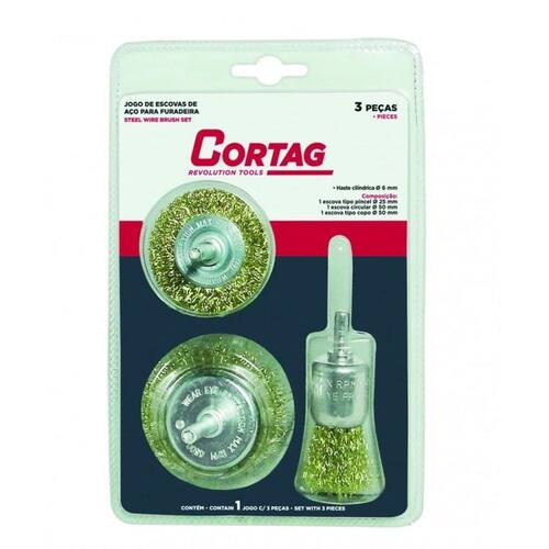 Jogo de escovas de aço para furadeira com 3 peças - cortag Itensinclusos 1 escova tipo pincel 25 mm;x005fx000d 1 escova circular 50 mm;x005fx000d 1 escova tipo copo 50 mm. Material default Cor default Uso em furadeira para limpeza/ desbaste em superfícies metálicas. Haste cilíndrica 6 mm. Marca: Não Informado