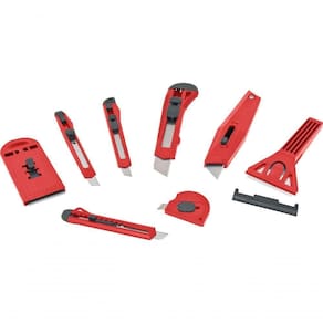 1 Jogo de estiletes, composto por 8 peças, sendo: 3 estiletes 9 mm, 1 estilete 18 mm, 1 estilete trapezoidal, 2 raspadores e 1 cortador de papel