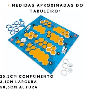 Contém na embalagem: 01 tabuleiro, 06 marcadores azuis, 06 marcadores brancos, 2 conjuntos de peças nas cores azul e branco, com 13 peças cada, nos seguintes formatos: 5 simples; 4 duplas; 3 triplas; 1 quádrupla.