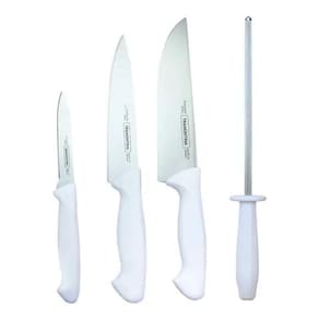 Jogo De Faca Para Carne Cozinha Churrasco + Afiador 4pç Branco Jogo de Facas Tramontina Premium com Lâminas em Aço Inox e Cabos de Polipropileno Branco 3 Peças + Chaira Estriada Tramontina Premium com Haste em Aço Carbono Revestida com Cromo-Duro e Cabo de Polipropileno Branco 8 Para você preparar as refeições do dia a dia com praticidade você precisa contar com o Jogo de Facas Tramontina Premium com Lâminas em Aço Inox e Cabos de Polipropileno Branco 3 Peças. Com esse jogo você equipa sua cozinha com peças que possuem design moderno, cabo anatômico texturizado e fio de alta durabilidade. O conforto e segurança durante o manuseio são garantidos e os itens podem ser lavados na máquina de lavar louças. São três modelos de facas especificas para cada uso, que garantem ainda mais qualidade e facilidade no corte de diferentes alimentos As lâminas de aço inox tem maior durabilidade do fio devido ao tratamento térmico.Os cabos de polipropileno possuem maior resistência e durabilidade.Podem ir à máquina de lavar louças facilitando seu dia a dia. Recomendações de Uso: Antes da primeira utilização, lave bem as peças e seque-as.Produtos cortantes e perfurantes: tenha cuidado ao manusear e mantenha fora do alcance das crianças.Para maior durabilidade dos produtos recomenda-se secar bem antes de guardar, mesmo após lavagem em máquina.Recomenda-se o uso de tábuas de polipropileno ou madeira da Tramontina para maior durabilidade do fio das facas.Não é indicado o uso das facas para o corte de alimentos congelados.Mantenha sempre suas facas afiadas utilizando os afiadores da Tramontina.Para descarte dos produtos e embalagens siga as orientações de reciclagem vigentes. CHAIRA TRAMONTINA PREMIUM A Chaira Tramontina Premium com Haste em Aço Carbono Revestida com Cromo-Duro e Cabo de Polipropileno Branco 8 Polegadas é um item indispensável para que você possa manter suas facas sempre afiadas. Produzida com haste em aço carbono revestido com cromo-duro, é uma peça altamente resistente e durável que garante um fio perfeito para suas facas. Seu cabo em polipropileno na cor branca proporciona um manuseio confortável e seguro, pois possui textura que auxilia para que suas mãos não deslizem pela peça. A Chaira Tramontina é fácil de limpar e pode ser lavada na máquina de lavar louças. Prática e funcional, essa peça não pode faltar na sua cozinha, garanta já a sua Informações Gerais: Haste em aço carbono revestida com cromo-duro.O cabo de polipropileno possui maior resistência e durabilidade.Pode ir à máquina de lavar louças facilitando seu dia a dia. Recomendações de Uso: Antes da primeira utilização, lave bem as peças e seque-as.Tenha cuidado ao manusear produtos cortantes e perfurantes e mantenha-os fora do alcance de crianças.Para maior durabilidade dos produtos, recomenda-se secar bem antes de guardar, mesmo após lavagem em máquina.Para descarte dos produtos e embalagens siga as orientações de reciclagem vigentes. Peso: 0,08 kg Conteúdo1 Faca para Frutas e Legumes 4 Premium1 Faca Utility 6 Premium1 Faca para Cozinha 7 Premium1 Chaira estriada Tramontina Premium com Haste em Aço Carbono