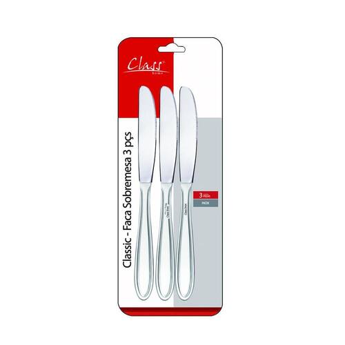 Jogo De Faca Classic Sobremesa 3 Peças A faca de sobremesa Classic com um tamanho médio, ela é ideal para comer sobremesas com caldo, líquidas ou cremosas. Ajuda a pegar o alimento ou cortar alimentos finos. Ficha técnica: Produto: - Comprimento: 18,2 cm - Material: Inox - Marca: Class Home - Cor: Inox - Itens inclusos: 3 facas Embalagem: - Altura: 40 cm - Largura: 22 cm - Comprimento: 30 cm - Peso: 800k - Material: Colmeia/papelão Cuidados: Para limpeza utilizar detergente neutro e uma esponja macia; Medidas aproximadas. Imagens meramente ilustrativas. Marca: Não Informado Ean: 7899887405205