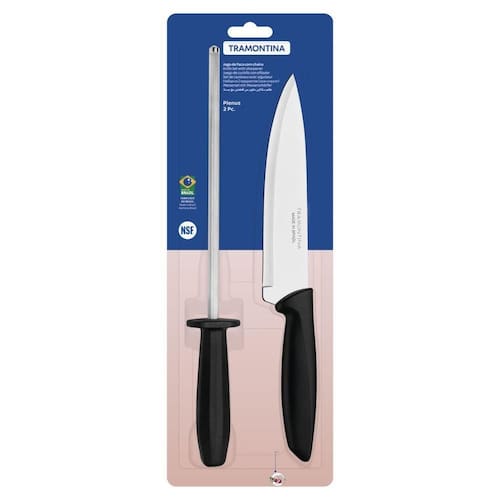 Jogo De Faca Com Chaira Tramontina Plenus Com Laminas Em Aço Inox E Cabos De Polipropileno Preto 2 Peças Jogo de Faca com Chaira Tramontina Plenus com Lâminas em Aço Inox e Cabos de Polipropileno Preto 2 Peças Suas melhores receitas vão ficar ainda mais saborosas com o Jogo de Faca com Chaira Tramontina Plenus com Lâminas em Aço Inox e Cabos de Polipropileno Preto 2 Peças da Linha Plenus. Ideais para o corte de diversos alimentos e para afiar ou manter o fio, as duas peças são produzidas com materiais de qualidade. Os cabos em polipropileno na cor preta são resistentes e confortáveis durante o manuseio. A lâmina da faca é em aço inox e se adequa a todo tipo de uso. Perfeitas para o preparo de alimentos ao serviço de mesa. Fáceis de limpar, podem ser levadas à máquina de lavar louças.
