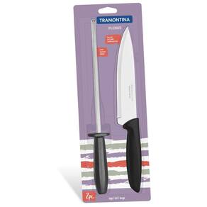 Jogo de Faca com Chaira Tramontina Plenus com Lâminas em Aço Inox e Cabos de Polipropileno Preto 2 Peças Suas melhores receitas vão ficar ainda mais saborosas com o Jogo de Faca com Chaira Tramontina Plenus com Lâminas em Aço Inox e Cabos de Polipropileno Preto 2 Peças da Linha Plenus. Ideais para o corte de diversos alimentos e para afiar ou manter o fio, as duas peças são produzidas com materiais de qualidade. Os cabos em polipropileno na cor preta são resistentes e confortáveis durante o manuseio. A lâmina da faca é em aço inox e se adequa a todo tipo de uso. Perfeitas para o preparo de alimentos ao serviço de mesa. Fáceis de limpar, podem ser levadas à máquina de lavar louças.