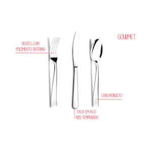 Com peças robustas e imponentes, a linha de talheres Gourmet traz sofisticação à mesa por um ótimo custo-benefício. A faca de sobremesa é perfeita para servir tortas, cheesecakes ou frutas após a refeição. A estrutura e o cabo em aço inox superpolido tornam a peça altamente durável e resistente, não correndo risco de oxidar e podendo inclusive ir à máquina de lavar louça. Outro diferencial é o revestimento temperado que não deixa a faca arranhar o prato. De fabricação 100% nacional, os produtos da linha Gourmet aliam qualidade, beleza e preço justo. Este conjunto contém 12 peças.
