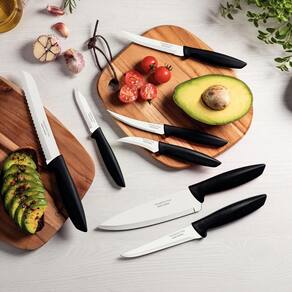 O Jogo de Facas Tramontina Plenus chegou para completar a sua cozinha e com mais praticidade e eficiência no momento de preparar as receitas! Todas as peças possuem lâminas em aço inox e cabos produzidos em polipropileno preto. Este conjunto de 7 facas é composto por itens de diferentes utilidades, como faca para desossar, para tornear, para legumes e frutas, para pão e chef. As facas garantem maior durabilidade no fio devido de corte, maior resistência e durabilidade. O Conjunto de facas vem com 01 Faca para Churrasco 5; 01 Faca para Tornear 3; 01 Faca para Legumes e Frutas 3; 01 Faca para Pão 7; 01 Faca para Desossar 5; 01 Faca Chef 7 e 01 Faca para Tomate 4.