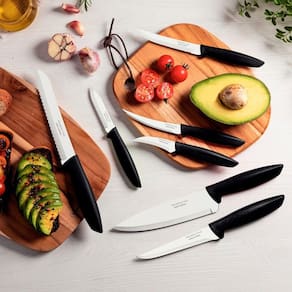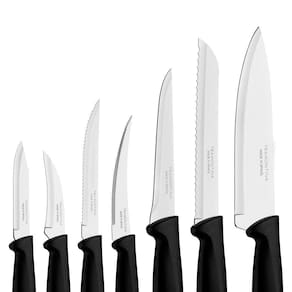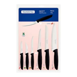Jogo De Facas 7 Peças Tramontina Plenus 23498066 Preto Tratamento do Talher: Tratamento Térmico;Cor: Aço Inox e Preto;Material: Aço Inox e Polipropileno;Garantia: 90 dias junto ao fabricante;Referência: 23498066;Pode ir à Maquina de Lavar Louças? SimItens Inclusos1 Faca para Churrasco / Frutas 5;1 Faca para Tornear 3;1 Faca para Legumes / Frutas 3;1 Faca para Pão 7;1 Faca para Desossar 5;1 Faca Chef 7;1 Faca para Tomate 4
