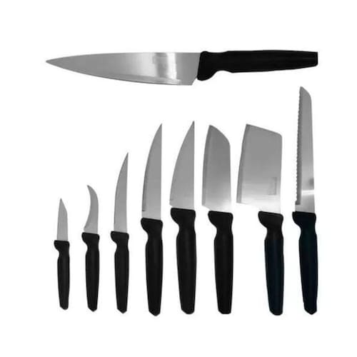 01 Faca De Chef O 01 Faca De Pão O 01 Cutelo O 01 Santoku O 01 Faca De Desossar O 01 Faca De Tomate O 01 Faca De Churrasco O 01 Faca De Legumes O 01 Faca Tornear