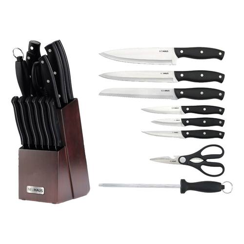 O Kit Nexus Neuhaus 14 Peças reúne todas as facas essenciais para o dia a dia culinário, além de acessórios indispensáveis como tesoura e chaira. Cada peça foi pensada para oferecer eficiência, controle e segurança, tornando o preparo dos alimentos mais rápido e prazeroso. Ideal para cozinhas modernas, o conjunto combina funcionalidade e design premium, sendo perfeito tanto para uso doméstico quanto para quem busca um toque profissional no preparo das refeições. Características • Conjunto completo com 14 peças essenciais• Lâminas em aço inoxidável resistentes e duráveis• Cortes precisos para carnes, pães, legumes e frutas• Cabos ergonômicos em PP para maior conforto e segurança• Cepo em madeira de pinho elegante e funcional• Organização prática, mantendo as facas sempre acessíveis• Design moderno que valoriza qualquer cozinha Especificações Técnicas • Material das lâminas: Aço inoxidável• Material dos cabos: Polipropileno (PP)• Material do cepo: Madeira de pinho• Linha: Nexus Composição do Kit • 1 Faca do Chef – 21 cm• 1 Faca de Fatiar – 21 cm• 1 Faca de Pão – 21 cm• 1 Faca Utility – 12 cm• 1 Faca de Descascar – 9 cm• Facas para Carnes – 9 cm• 1 Chaira• 1 Tesoura de Cozinha• 1 Cepo em Madeira de Pinho Informações Adicionais • Marca: Neuhaus• Código: 360101.14 Marca: Não Informado