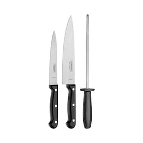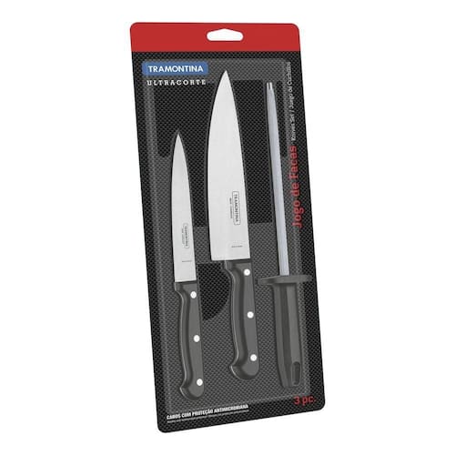 Jogo De Facas Com Chaira Tramontina Ultracorte Com Laminas Em Aço Inox E Cabos De Polipropileno Preto 3 Peças Jogo de Facas com Chaira Tramontina Ultracorte com Lâminas em Aço Inox e Cabos de Polipropileno Preto 3 Peças O Jogo de Facas com Chaira Tramontina Ultracorte com Lâminas em Aço Inox e Cabos de Polipropileno Preto 3 Peças da Linha Ultracorte é perfeito tanto as receitas diárias quanto para os momentos em família aos domingos. O conjunto de 3 peças é ideal para corte e manter o fio das facas. As lâminas das facas são de aço inox e possuem tratamento térmico que dão maior durabilidade ao fio. Os cabos são de polipropileno com proteção antibacteriana, que inibem o crescimento de fungos e bactérias. A chaira é produzida de aço revestido de cromo duro. São produtos de qualidade essenciais para o preparo de suas receitas. Fáceis de limpar e confortáveis no uso, podem ser levados à máquina de lavar louças.