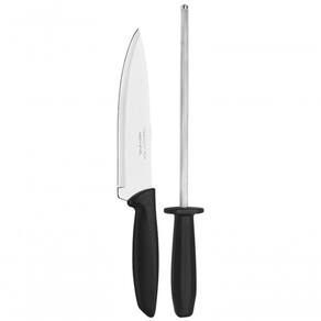 - Chaira com Haste em aço carbono revestida com cromo-duro.- Faca com Lâmina em aço inox.- Cabo de polipropileno.- a Espessura do aço e formato das peças evita deformações.- A faca recebe tratamento térmico especial, o que dá maior durabilidade ao fio.- resistente à máquina de lavar louças.