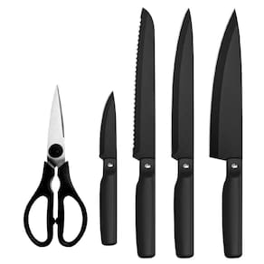 O kit é composto por 6 peças, sendo quatro facas para diferentes funções, uma tesoura e um suporte.