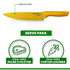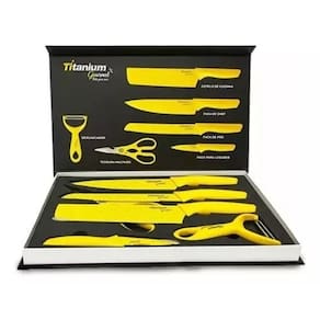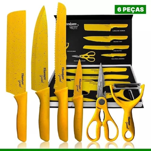 DESCRIÇÃO: Jogo de Facas Premium 6 peças1 - Faca de chef 20,3 cm1 - Faca para Pão 20,3 cm1 - Cutelo de Cozinha 20,3 cm1 - Faca para Legumes 15,3 cm1 - Descascador1 - Tesoura Multiuso Facas: Com Cabo em Plástico de alta qualidade, com lâmina em Aço Inoxidável na cor Amarelo Marca: Titanium do Brasil.