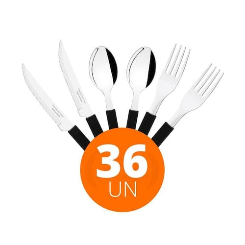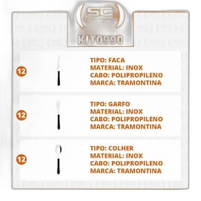 OBS: Veja na descrição os itens que acompanham o jogo. COMPONENTES DO KIT: - 12 Faca para Churrasco Leme com Lâmina em Aço Inox e Cabo de Polipropileno Preto 4- Tramontina 23180404 - 12 Garfo de Mesa Leme com Lâmina em Aço Inox e Cabo de Polipropileno Preto - Tramontina 23182400 - 12 Colher de Sopa Leme com Lâmina em Aço Inox e Cabo de Polipropileno Preto - Tramontina 23183400 : 90 dias para vícios ou defeitos de fabricação; - Ideal para Restaurante, Lancheria, Paderia, Linha Doméstica, Residência, Gourmet; Faca para Churrasco Leme com Lâmina em Aço Inox e Cabo de Polipropileno Preto 4- Tramontina 23180404 - Pode ir à máquina de lavar louças facilitando seu dia a dia. - Peso Líquido: 0,016 kg. - Peso Bruto: 0,016 kg. - Dimensões Embalagem : 9cm A X 18cm L X 20cm P Garfo de Mesa Leme com Lâmina em Aço Inox e Cabo de Polipropileno Preto - Tramontina 23182400 - A lâmina de aço inox garante maior resistência devido a espessura do aço e a estampagem da lâmina. - Pode ir à máquina de lavar louças facilitando seu dia a dia. - Peso Líquido: 0,021 kg. - Peso Bruto: 0,025 kg. - Dimensões Produto: 13cm A x 23cm L x 18,5cm P. Colher de Sopa Leme com Lâmina em Aço Inox e Cabo de Polipropileno Preto - Tramontina 23183400 - A lâmina de aço inox garante maior resistência devido a espessura do aço e a estampagem da Lâmina. - Pode ir à máquina de lavar louças facilitando seu dia a dia. - Peso Líquido: 0,027 kg. - Peso Bruto: 0,029 kg. - Medidas Extrenas: 18,3cm x 3,9cm concha Marca: Não Informado