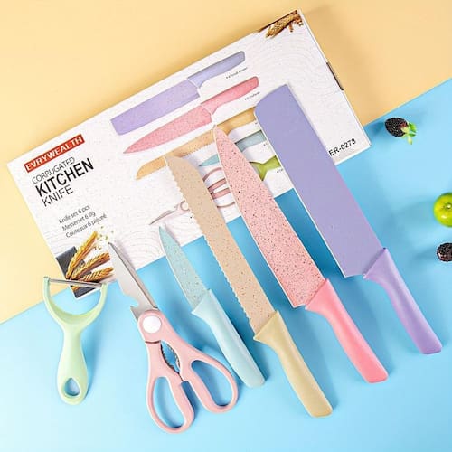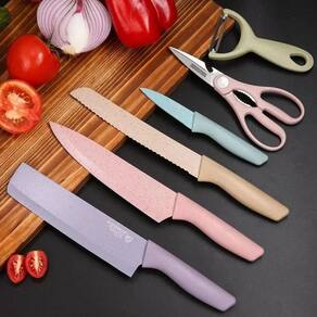 Quer dar vida àquela cozinha pálida e sem graça Que tal começar com um conjunto de facas maravilhoso e de alta qualidade Conjunto de facas em Aço Inoxidável com tratamento antiferrugem e revestimento colorido. Cabos fabricados em polipropileno e superfície antiderrapante, proporcionam conforto e estabilidade no manuseio das facas.