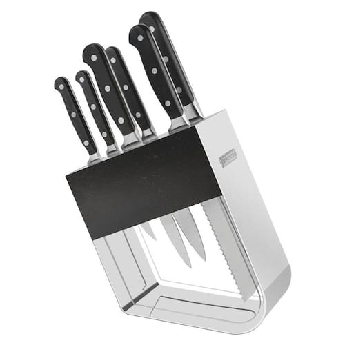 Jogo De Facas Inox 7 Peças Century Tramontina - 24099/016 Conteúdo: 1 - 24000/003 - Faca para legumes 3 1 - 24004/005 - Faca para churrasco 5 - fio serrilhado 1 - 24006/006 - Faca para desossar 6 1 - 24009/008 - Faca para pão 8 1 - 24010/006 - Faca para cozinha 6 1 - 24011/008 - Faca Chef 8 1 - Suporte para facas Descrição: As facas da linha Century são desenvolvidas especialmente para uso intenso. Recebem tratamento térmico composto por têmpera aquecimento da lâmina , subzero resfriamento de 50 a 196 graus negativos e revenimento aumento da flexibilidade do aço especial , que lhes dá vida longa e eficiente. A segurança durante o manuseio é oferecida pelo conforto do cabo anatômico e ergonômico. De policarbonato com fibra de vidro, é injetado diretamente sobre a espiga de aço e finalizado com acabamentos em rebites de alumínio. A Linha Century tem garantia de 25 anos contra defeitos de fabricação e é Certificada pelo NSF, National Sanitation Foudation, organização reconhecida internacionalmente pelas práticas de consultoria, inspeção e treinamento, voltados à garantia da sanidade de alimentos, água, ar e ambiente. Podem ser levadas à máquina de lavar louças. Facas com lâminas de aço inox e cabos de policarbonato com fibra de vidro. Suporte de acrílico, aço inox e madeira. Uso seguro: Antes da primeira utilização, lave bem as peças e seque-as. Tenha cuidado ao manusear produtos cortantes e perfurantes e mantenha-os fora do alcance de crianças. Para maior durabilidade dos produtos, recomenda-se secar bem antes de guardar, mesmo após lavagem em máquina. Para descarte dos produtos e embalagens siga as orientações de reciclagem vigentes. Complemento: EAN13: 7891112070516 DUN14: 17891112070513 NCM: 8211.10.00 Peso Líquido: 2,3700 kg. Peso Bruto: 2,3700 kg. Metragem: 0,008789 m Dimensões Embalagem Compr. X Larg. X Alt. : 107x 222x 370 mm. Dimensões Produto Compr. X Larg. X Alt. : 107x 222x 370 mm. Cor 1: 000000 Hexa Ean: 7891112070516