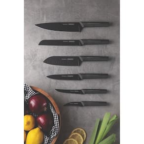 Conteúdo da embalagem: 01 Faca chef 8" - Toda versatilidade da protagonista da cozinha 01 Faca utility 6" - Ponta espada, auxilia na perfuração e abertura dos alimentos 01 Faca para tornear 3" - Torneia, descasca e esculpe frutas e legumes 01 Faca para pão 8" - A lâmina serrilhada corta sem amassar 01 Faca santoku 7" - Ideal para cortar, fatiar e picar 01 Faca pata churrasco/frutas 5" - Fio serrilhado para corte de de carnes e frutas