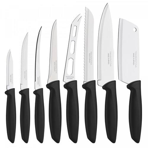 Jogo de facas 8 peças Jogo modelo Plenus Tramontina composto 08 facas, com lâminas fabricadas em aço inox de alta qualidade e cabos em polipropileno, matéria-prima semelhante ao plástico que apresenta ótima resistência e durabilidade. Características Marca Tramontina Modelo 23498/032 Quantidade de facas 8 Tipos de facas Diversas Material da lâmina Lâminas em aço inox Material do punho Cabos de polipropileno O kit possui 01 cutelo, 01 faca chefe, 01 faca para pão, 01 faca para queijo, 01 faca para desossa, 01 faca para tomate, 01 faca para churrasco/frutas e 01 faca para legumes/frutas. Contam com design simples e arrojado com ótima performance no uso utilitário. Um conjunto que agregará beleza, praticidade e eficiência à sua cozinha. Resistentes à maquina de lavar. Indústria brasileira líder em satisfação dos consumidores e presente em mais de 120 países, a Tramontina vem desde 1911 buscando atender os clientes mais exigentes com produtos que combinem qualidade, inovação e tecnologia. Composição jogo de facas Plenus Tramontina 01 Cutelo Comprimento - 26 cm 01 Faca Chef Comprimento - 30 cm 01 Faca para pão Comprimento - 29 cm 01 Faca para queijo Comprimento - 28 cm 01 Faca para desossa Comprimento - 26 cm 01 Faca para tomate Comprimento - 23 cm 01 Faca para churrasco/frutas Comprimento - 22 cm 01 Faca para legumes/frutas Comprimento - 18 cm Ean: 7891112253391