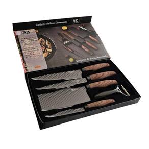 CONTEUDO DO KIT 01 Faca de Cozinha 20,32cm lâmina e 33cm total 01 Faca do Chef 20,32cm lâmina e 33cm total 01 Cutelo 17,78cm lâmina e 30,5cm total 01 Faca de Legumes 12,7cm lâmina e 24,5cm total 01 Tesoura de Cozinha Multiuso 20cm 01 Descascador de Legumes 14cm