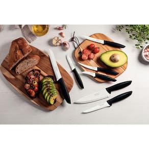 Lâminas de aço inox com maior durabilidade do fio devido ao tratamento térmico. Cabos de polipropileno com maior resistência e durabilidade. Podem ir à máquina de lavar louças facilitando seu dia a dia.