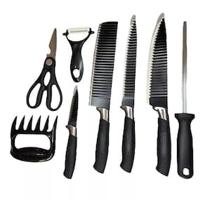 01 faca de chef 01 faca multiuso 01 faca para legumes 01 cutelo 01 amolador/afiador 01 tesoura multiuso 01 descascador 01 garfo para carne