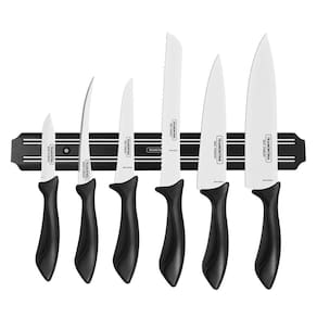 Jogo de Facas Tramontina Affilata Inox e Cabos Preto com Barra Magnética 7 Peças Sua cozinha ficará mais bonita e completa com o Jogo de Facas Tramontina Affilata com Lâminas em Aço Inox e Cabos de Polipropileno Preto com Barra Magnética 7 Peças. São seis facas para as mais variadas funções, perfeitas para atender as exigências de diferentes alimentos e receitas. As lâminas de aço inox das facas garantem maior durabilidade do fio e os cabos de polipropileno na cor preta apresentam maior resistência. Além disso, acompanha barra magnética de 38 cm que torna o visual da sua cozinha mais moderno, prático e organizado. Como utilizar o produto Antes da primeira utilização, lave bem as peças e seque-as. Produtos cortantes e perfurantes: tenha cuidado ao manusear e mantenha fora do alcance das crianças. Para maior durabilidade dos produtos recomenda-se secar bem antes de guardar, mesmo após lavagem em máquina. Recomenda-se o uso de tábuas de polipropileno ou madeira da Tramontina para maior durabilidade do fio das facas. Não é indicado o uso das facas para o corte de alimentos congelados. Mantenha sempre suas facas afiadas utilizando os afiadores da Tramontina. Para descarte dos produtos e embalagens siga as orientações de reciclagem vigentes. As lâminas de aço inox têm maior durabilidade do fio devido ao tratamento térmico. Os cabos de polipropileno possuem maior resistência e durabilidade. Podem ir à máquina de lavar louças facilitando seu dia a dia. Barra indicada para facas com lâminas de características ferro magnéticas. Acompanha parafusos e buchas para fixação. Especificação Técnica: EAN13: 7891112264908 DUN14: 17891112264905 NCM: 8211.10.00 Peso Líquido: 0,6850 kg. Peso Bruto: 0,9200 kg. Metragem: 0,004566 m³. Cor 1: 000000 Hexa Conteúdo do Jogo: 1 23654108 Faca Chef Tramontina Affilata com Lâmina em Aço Inox 1 23653105 Faca para Desossar Tramontina Affilata com Lâmina em Aço Inox 1 23650103 Faca para Legumes e Frutas Tramontina Affilata com Lâmina em Inox 1 23652108 Faca para Pão Tramontina Affilata com Lâmina em Aço Inox 1 23657105 Faca para Tomate Tramontina Affilata com Lâmina em Aço Inox 1 23655107 Faca Utility Tramontina Affilata com Lâmina em Aço Inox