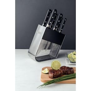 A rotina na cozinha fica ainda mais prática quando contamos com facas de alta qualidade. Com o Jogo de Facas Tramontina Century com Lâminas em Aço Inox e Cabos de Policarbonato e Fibra de Vidro com Suporte 7 Peças da linha Century você terá as melhores facas ao seu alcance. As faças são produzidas com lâminas de aço inox de altíssima qualidade que, aliada ao eficiente com tratamento térmico diferenciado, composto por têmpera, sub-zero e revenimento, além de dureza de 55 e 58 HRc, lhe garantem vida longa e eficiente. Para tornar o manuseio confortável e seguro, as facas contam com cabo anatômico e ergonômico em policarbonato com fibra de vidro. Acompanha suporte de acrílico com aço inox, para fazer bonito na sua bancada. Orientações As lâminas forjadas de aço inox especial garantem um fio com maior durabilidade e precisão. As lâminas possuem tratamento térmico diferenciado, composto por têmpera, sub-zero e revenimento. E contam com dureza da lâmina de 55 e 58 HRC, que garante maior resistência do fio e precisão no corte. Os cabos de policarbonatos reforçado com fibra de vidro garante alta durabilidade, equilíbrio e segurança. Os cabos ergonômicos proporcionam maior segurança, equilíbrio e conforto na hora do corte. Suporte de acrílico com aço inox que oferece uma proteção as peças. Podem ir à máquina de lavar louças facilitando seu dia a dia. Características Gerais EAN13 7891112070516 DUN14 17891112070513 NCM 8211.10.00 Peso Líquido 2,3700 kg. Peso Bruto 2,8250 kg. Metragem 0,008508 m³. Dimensões Embalagem (Compr. X Larg. X Alt.) 222x 105x 365 mm. Cor 1 000000 Hexa Observações Antes da primeira utilização, lave bem as peças e seque-as.Produtos cortantes e perfurantes: tenha cuidado ao manusear e mantenha fora do alcance das crianças.Para maior durabilidade dos produtos recomenda-se secar bem antes de guardar, mesmo após lavagem em máquina. Recomenda-se o uso de tábuas de polipropileno ou madeira da Tramontina para maior durabilidade do fio das facas. Não é indicado o uso das facas para o corte de alimentos congelados. Mantenha sempre suas facas afiadas utilizando os afiadores da Tramontina.Para descarte dos produtos e embalagens siga as orientações de reciclagem vigentes.