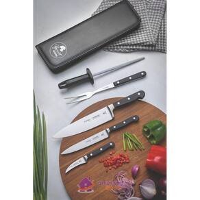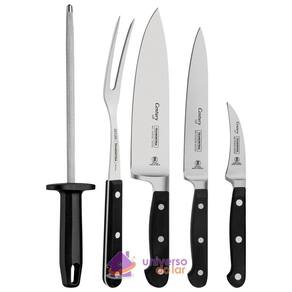 Jogo de Facas Tramontina Century com Lâminas em Aço Inox e Cabos de Policarbonato e Fibra de Vidro com Estojo 6 Peças Os melhores momentos na cozinha em casa, surgem quando oferecemos o melhor para as pessoas que a gente gosta. Para isso, é essencial contarmos com itens de qualidade. Você vai ter muita praticidade a partir de agora com o Jogo de Facas Tramontina Century com Lâminas em Aço Inox e Cabos de Policarbonato e Fibra de Vidro com Estojo 6 Peças, da linha Century. O jogo vem em um belíssimo estojo sintético e conta com facas com lâminas de aço inox forjadas de altíssima qualidade que, aliada ao eficiente com tratamento térmico diferenciado, composto por têmpera, sub-zero e revenimento, além de dureza de 55 e 58 HR e cabos de policarbonato com fibra de vidro, garfo trinchante com lâmina de aço inox e cabo de polipropileno e chaira com haste de aço carbono cromado e cabo de polipropileno. Ou seja, tudo que você pode precisar para realizar as melhores receitas e conseguir um sabor inesquecível para os momentos especiais em casa. Informações Gerais As lâminas forjadas de aço inox especial garantem um fio com maior durabilidade e precisão. As lâminas possuem tratamento térmico diferenciado, composto por têmpera, sub-zero e revenimento. E contam com dureza da lâmina de 55 e 58 HRC, que garante maior resistência do fio e precisão no corte. Os cabos de policarbonato reforçado com fibra de vidro garante alta durabilidade, equilíbrio e segurança. Garfo trinchante com lâmina de aço inox e cabo de polipropileno. Chaira com haste de aço inox especial garante um com maior durabilidade, precisão para a afiação e cabo de polipropileno garante alta durabilidade, equilíbrio e segurança. O cabo ergonômico proporciona maior segurança, equilíbrio e conforto. Estojo sintético que oferece uma proteção as peças, permitindo o transporte e armazenagem com maior segurança. Podem ir à máquina de lavar louças facilitando seu dia a dia. Recomendações de Uso Antes da primeira utilização, lave bem as peças e seque-as. Produtos cortantes e perfurantes: tenha cuidado ao manusear e mantenha fora do alcance das crianças. Para maior durabilidade dos produtos recomenda-se secar bem antes de guardar, mesmo após lavagem em máquina. Recomenda-se o uso de tábuas de polipropileno ou madeira da Tramontina para maior durabilidade do fio das facas. Não é indicado o uso das facas para o corte de alimentos congelados. Mantenha sempre suas facas afiadas utilizando os afiadores da Tramontina. Para descarte dos produtos e embalagens siga as orientações de reciclagem vigentes.