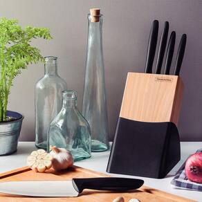 Você vai impressionar seus convidados com o jogo de facas Tramontina Plenus com lâminas em aço inox cabos de polipropileno preto e suporte de madeira 6 peças da linha Plenus. São cinco peças produzidas com cabos na cor preta de polipropileno e lâminas de aço inox, resistentes e fáceis de manusear, podendo ser levadas à máquina de lavar louças. Versáteis e com design moderno, se encaixam em diferentes usos. Podem serem usadas desde preparações mais simples até mais elaboradas. O jogo de facas é a escolha ideal para embelezar ainda mais o seu ambiente!